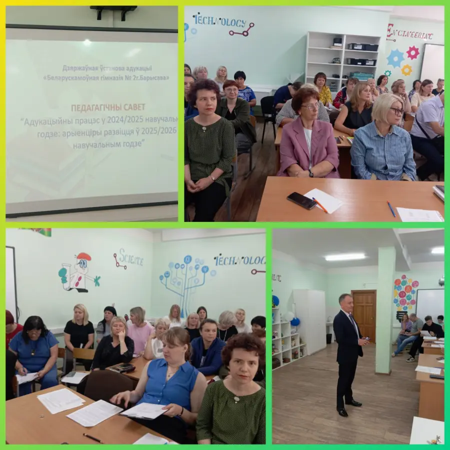 29 жніўня 2025 года ў гімназіі прайшло пасяджэнне педагагічнага савета "Адукацыйны працэс у 2024/2025 навучальным годзе - арыенціры развіцця ў 2025/2026 навучальным годзе”. Дырэктар гімназіі Анатолій Станіслававіч Забароўскі падвёў вынікі мінулага навучальнага года, агучыў дасягненні і поспехі калектыву. Было адзначана, што дасягнутыя вынікі працы ў цэлым адпавядаюць пастаўленым у пачатку года мэтам і задачам: па выніках штогадовага раённага конкурсу “За дасягненне высокіх паказчыкаў у развіцці адукацыі” на лепшую арганізацыю работы ўстаноў адукацыі Барысаўскага раёна па развіццю рэгіянальнай сістэмы адукацыі па выніках 2024 года калектыў гімназіі заняў 1 месца. Былі вызначаны задачы на наступны перыяд, асноўныя напрамкі адукацыйнага працэсу ў новым навучальным годзе.